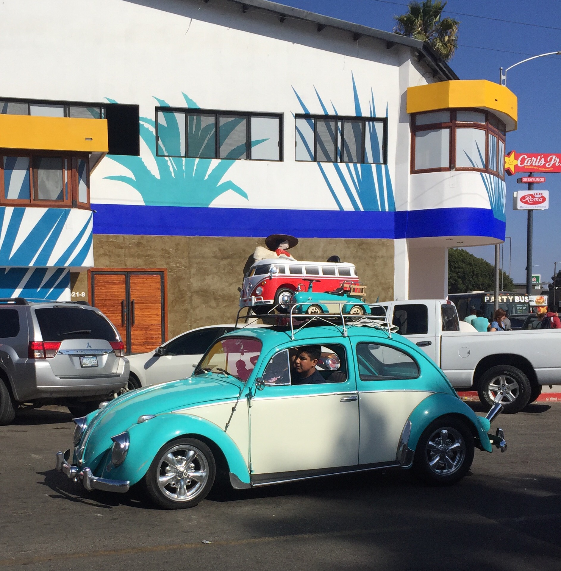 Carlos was crushed when he learned that they were out of pulpo. (To state the obvious, I was perfectly content with the shrimp status quo.) But then word spread amongst the patrons waiting to be served that another batch of pulpo was on its way and that anyone could supplement their half-eaten cocktail with some chopped up tentacles once it arrived. We loitered around the cart for what seemed to me an excessively long time. As we snarfed down our cocktails, a guy drove by who has much cooler Volkswagens (of varying sizes) than I do or ever will. I breathed a sigh of relief when Carlos finally gave up on the pulpo and begrudingly agreed to go somewhere else.